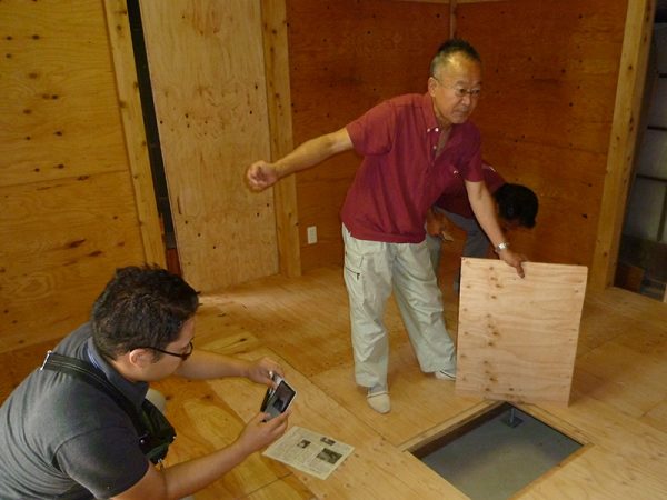 床下収納も案内し、災害時の非常食や簡易トイレも部屋の中で完結するメリットを説明